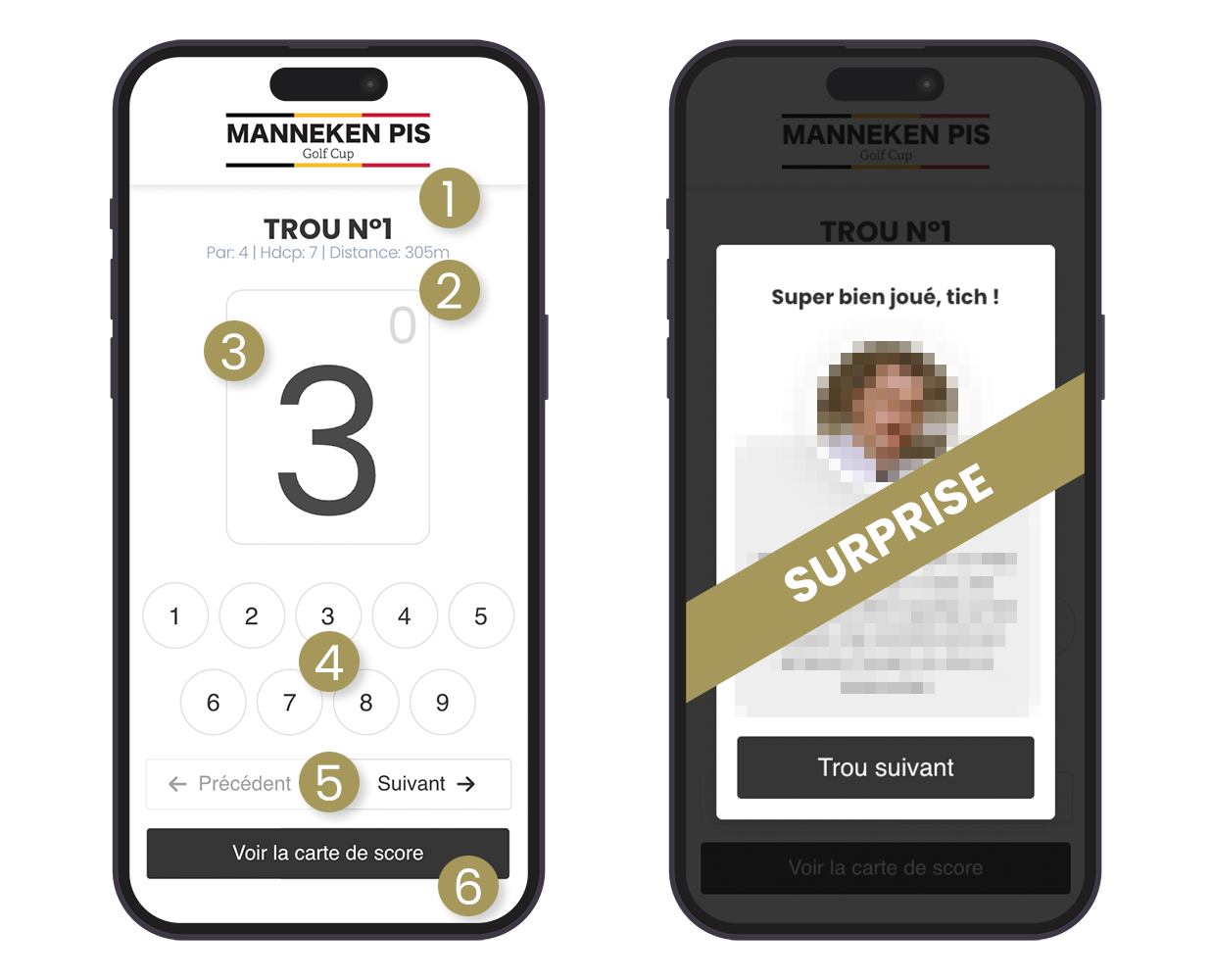 1. Informations du trou : Affiche les détails du trou actuellement joué, notamment le numéro du trou, le par, le handicap (hdcp), et la distance en mètres. Cela vous donne un aperçu des caractéristiques du trou. 2. Nombre de coups rendus : Indique le nombre de coups rendus pour ce trou en fonction du handicap de l’équipe. Cela vous aide à suivre les coups supplémentaires accordés sur ce trou. 3. Affichage du score actuel : Le score que vous avez sélectionné pour ce trou. Une fois entré, il sera mis à jour ici. 4. Boutons de sélection du score : Choisissez le nombre de coups réalisés sur le trou en cliquant sur l’un des boutons numérotés. Cela permet de soumettre votre score pour le trou en cours. Une fois votre score rentré vous serez directement invité à passer au trou suivant avec une petite surprise 5. Navigation entre les trous : Deux boutons permettent de naviguer entre les trous. Utilisez « Précédent » pour revenir au trou précédent ou « Suivant » pour avancer au trou suivant. 6. Voir la carte de score : Cliquez sur ce bouton pour accéder à la carte de score complète de votre équipe. Vous y verrez tous les scores accumulés pour chaque trou, ainsi que les statistiques importantes de votre partie. Dans la carte de score la fleche en haut a gauche vous permet de revenir à la page d’insertion des scores. Dans la carte des score le bouton en haut à gauche vous permettra de retourner dans la partie d’insertion des scores.